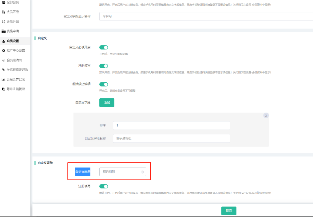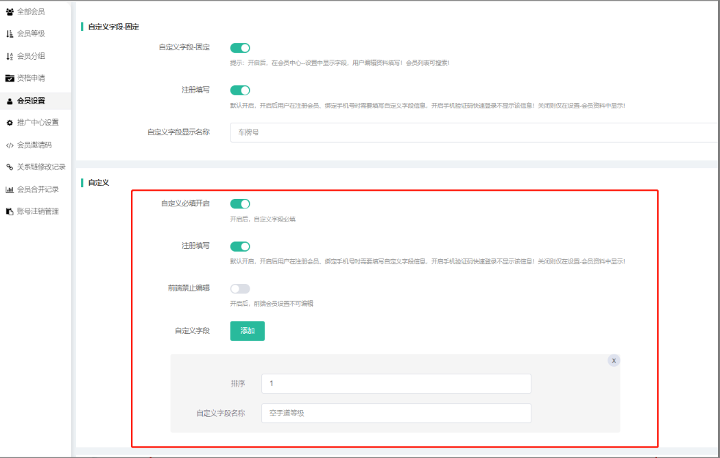 自定义字段-固定:提示:开启后,在会员中心--设置中显示字段,用户完善会员资料时需要填写自定义字段,在会员管理中支持按照自定义字段搜索信息!
