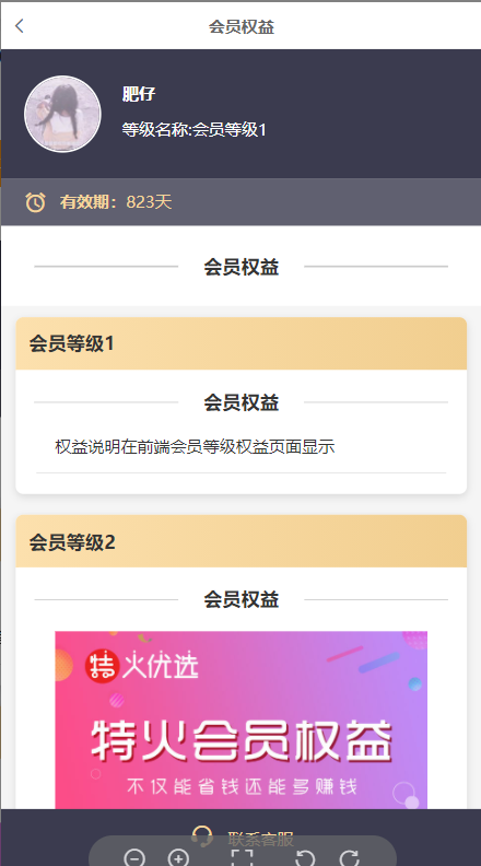 提示: 开启,用户在商品详情页和会员中心点击会员等级都可以进入等级权益页面,效果如下