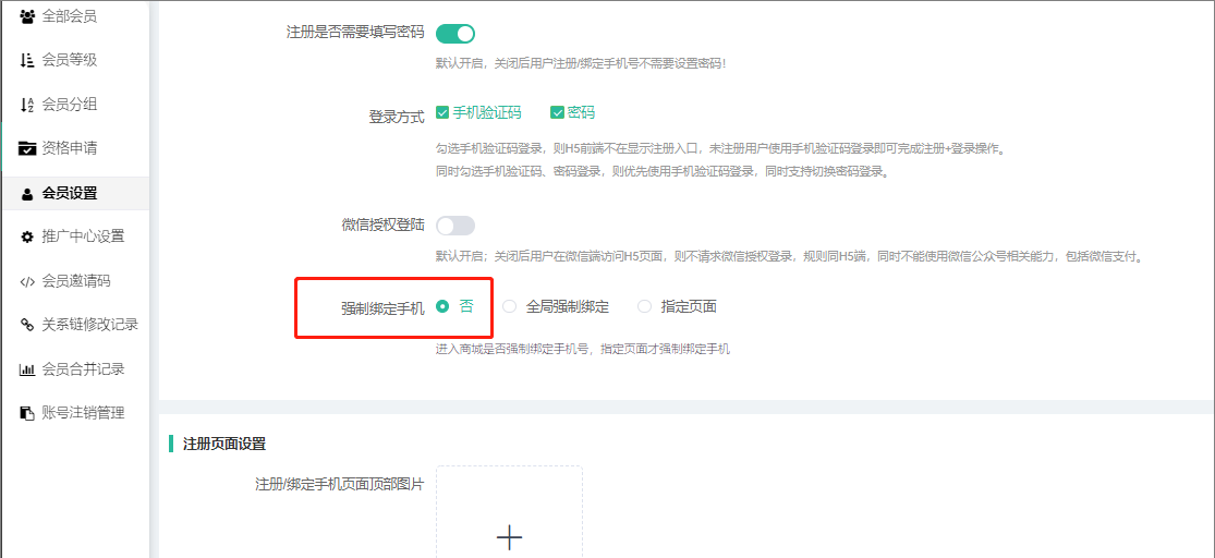 如果开启,用户进入商品详情页,会员中心等页面需要验证是否绑定手机号,如果没有,则跳转手机号绑定页面;开启本功能前,请确认已经设置短信功能。