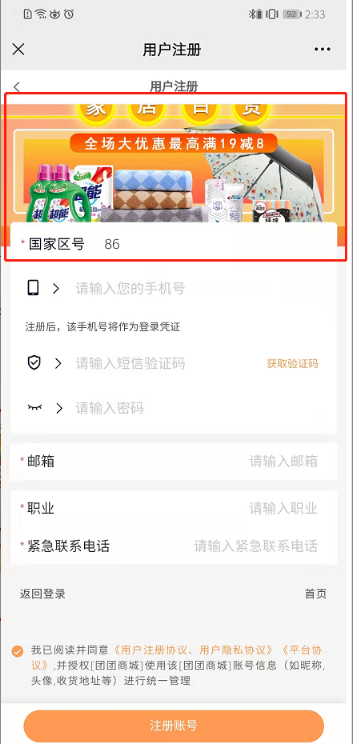 用户使用手机号注册、强制绑定手机号时勾选同意的注册协议。