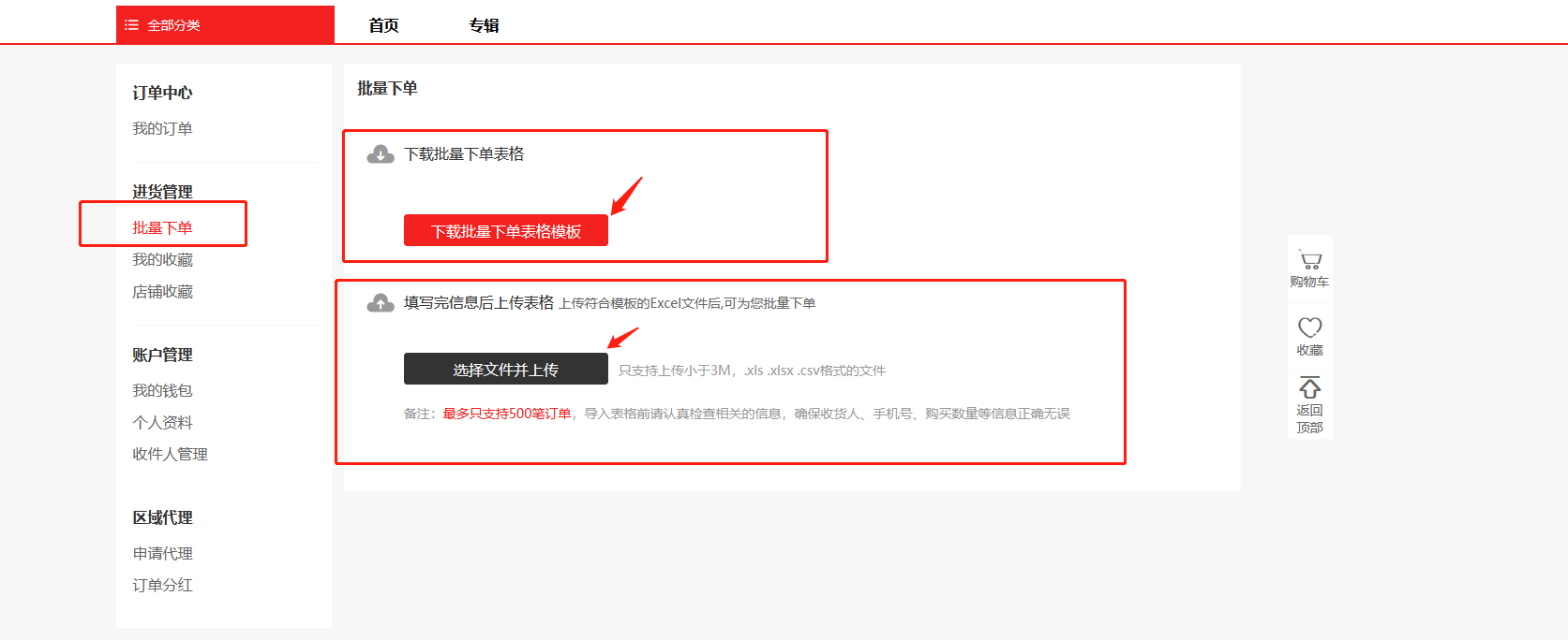 温馨提示:批量下单最多只支持500笔订单,导入表格前请认真检查相关的信息,确保收货人、手机号、购买数量等信息正确无误。