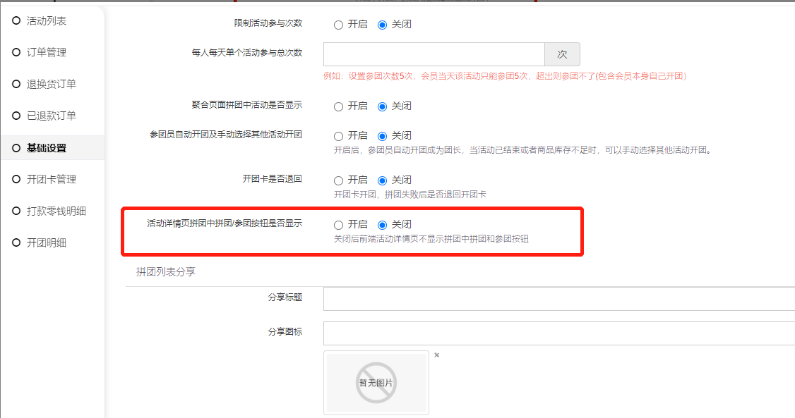 3, 聚合页面拼团中活动是否显示:开启后前端聚合页面,活动列表会显示正在拼团中的拼团