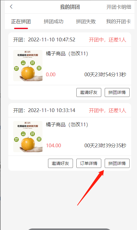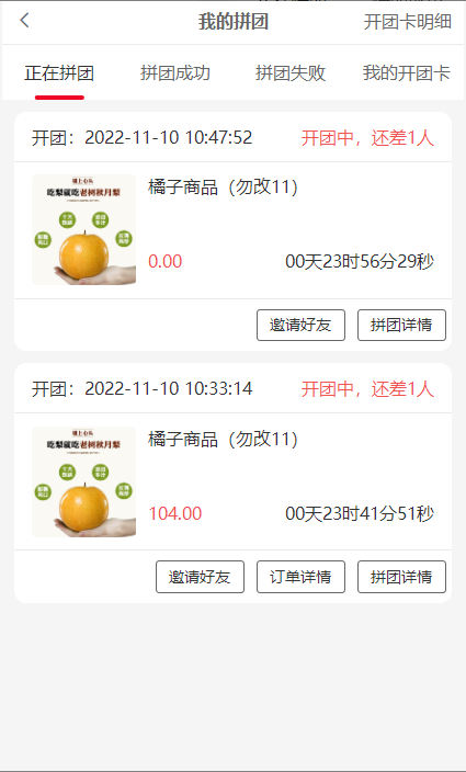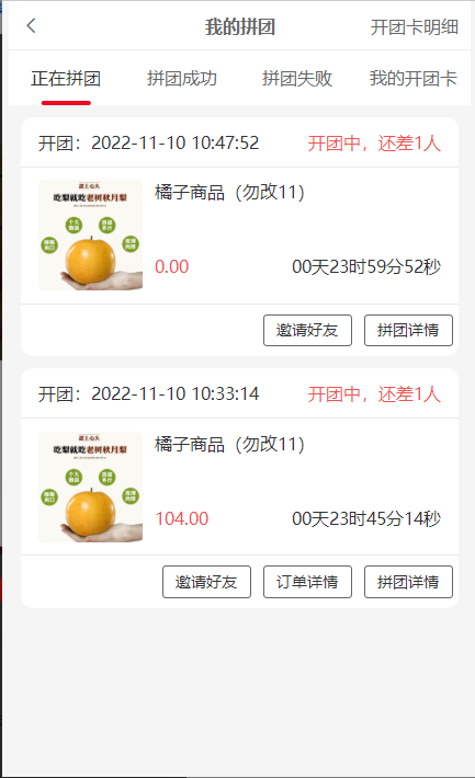2, 正在拼团:还未拼成功的团,状态处团长显示开团中,拼团会员显示拼团中,开团卡开的团没有订单详情按钮