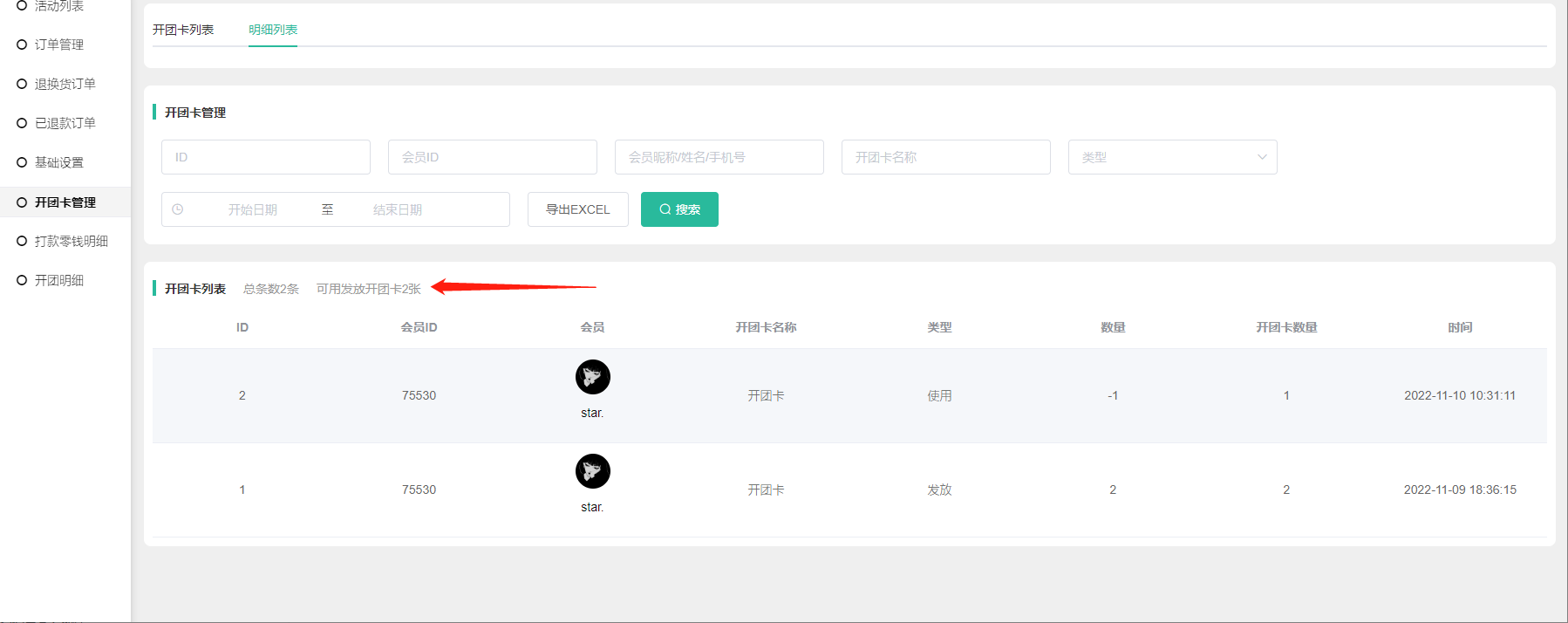 2) 开团卡数量:该开团卡该会员的可使用数量