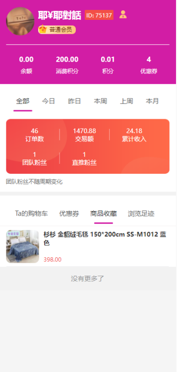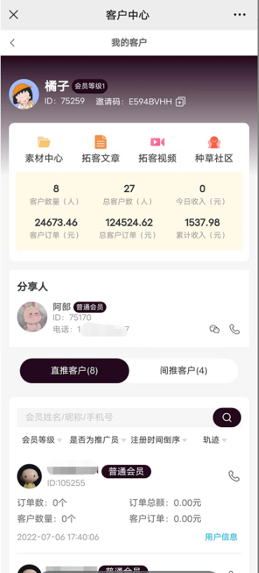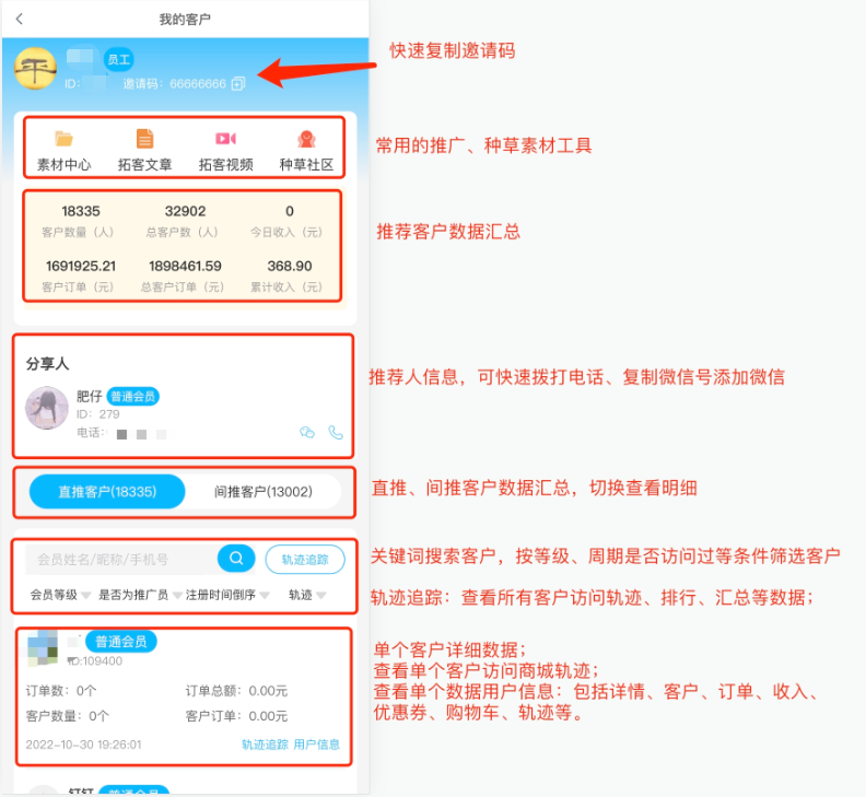 利用客户中心功能,会员可以掌握直推和间推客户的喜好动向,持续让他们买买买,以此来获得更多的收益轨迹追踪 推荐客户详情查看 全方位跟进客户动态。支持微信端、小程序端,若需要轨迹追踪,要搭配“浏览轨迹”插件使用!