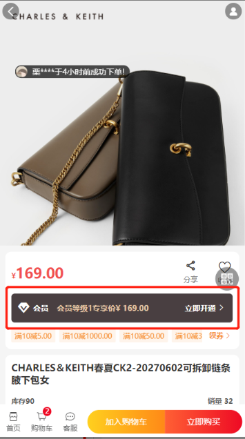 如:会员A分享商城某一链接给B,B点击链接进入商城后,购买某商品并提交订单(未付款)后,B就会成为会员A的下线。