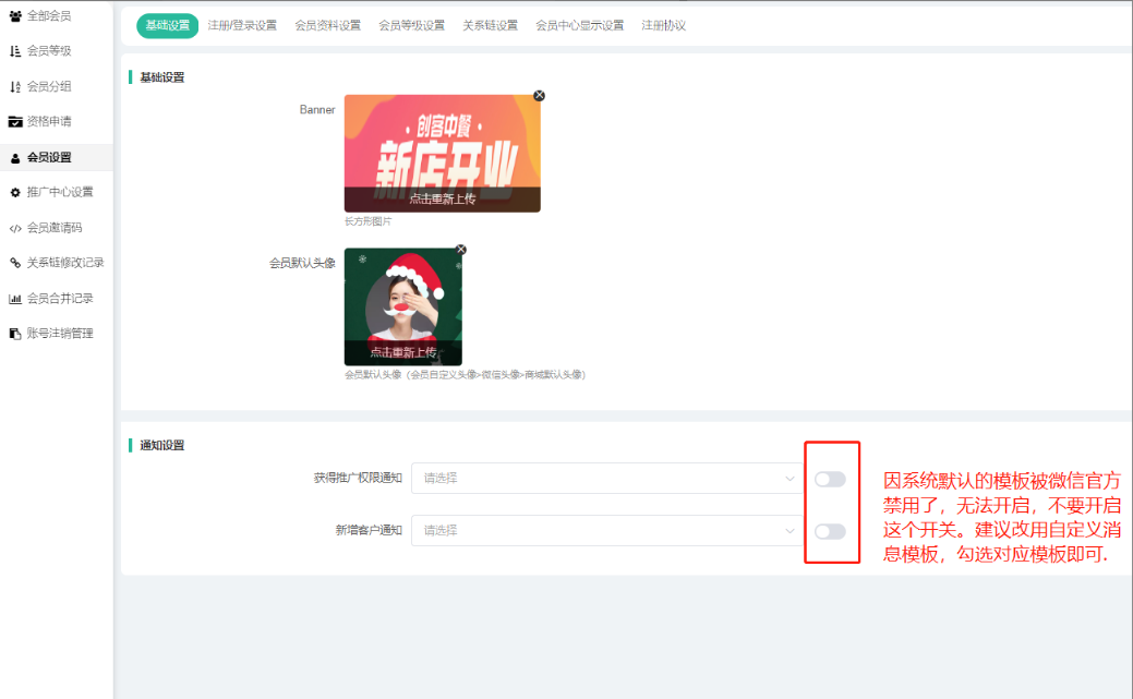 以上通知设置仅供参考,客户可根据自行运营模式添加模板和设置内容。