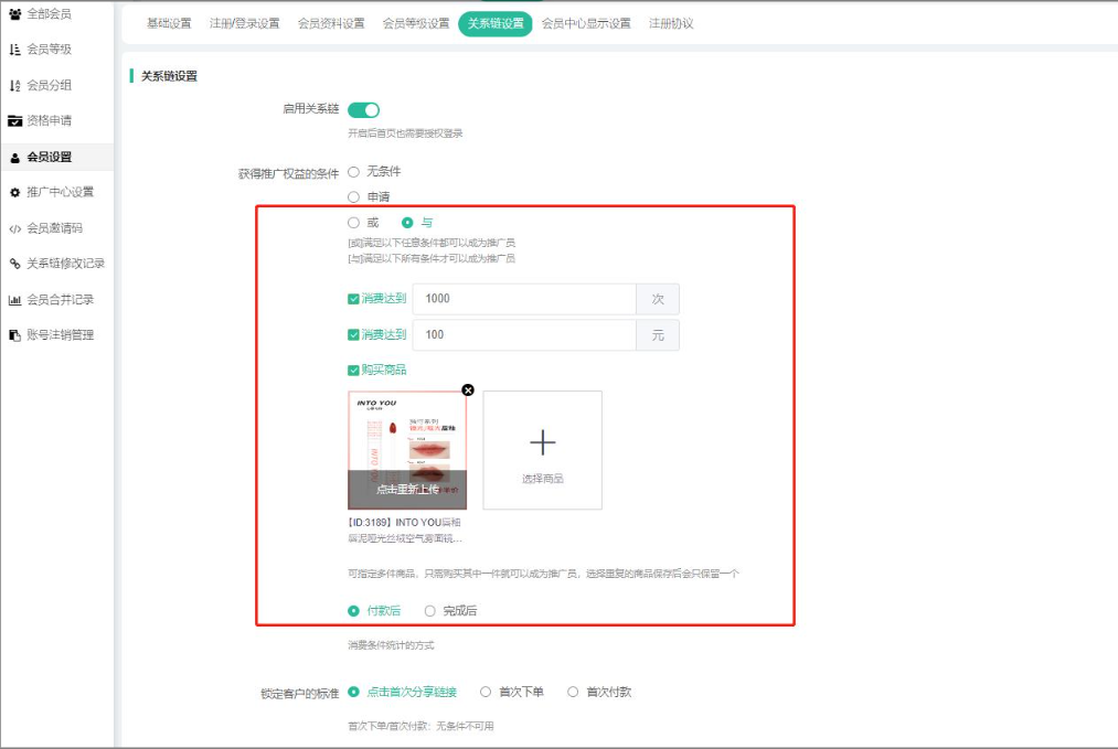 (三)成为下线条件:后台--会员管理--会员关系--会员关系设置,成为下线条件有三种,如下图:
