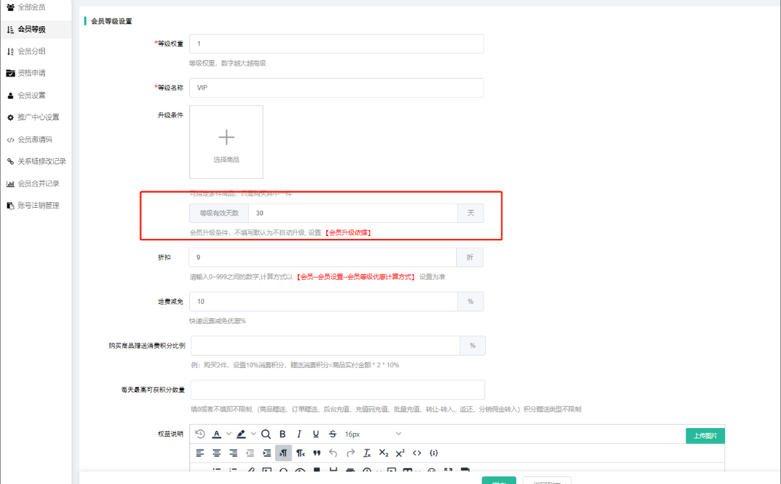 支持设置用户等级升级后多长时间有效,如果到期则恢复为默认等级;如果设置购买指定商品升级,则每购买一次指定商品,则增加指定周期的天数。比如设置VIP等级,购买A商品升级,有效期100天;则用户购买1个A商品获得VIP等级100天的有效期,再次购买1个A商品则增加VIP等级100天有效期。常见于年费、月度会员等机制。注意:若是手动调整会员等级,请注意手动加上天数,否则过了十分钟左右自动恢复原先会员等级。
