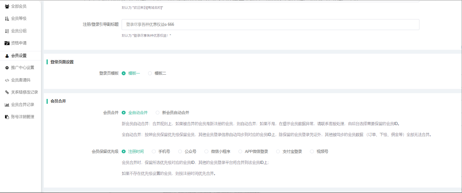 因平台有多个入口注册会员,多个账号同步过程中就涉及到账号合并的问题,目前商城的会员合并机制可以通过后台进行设置,如下图: