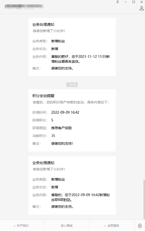 会员获得推广权限/新增客户,通过微信公众号进行推送公众号信息