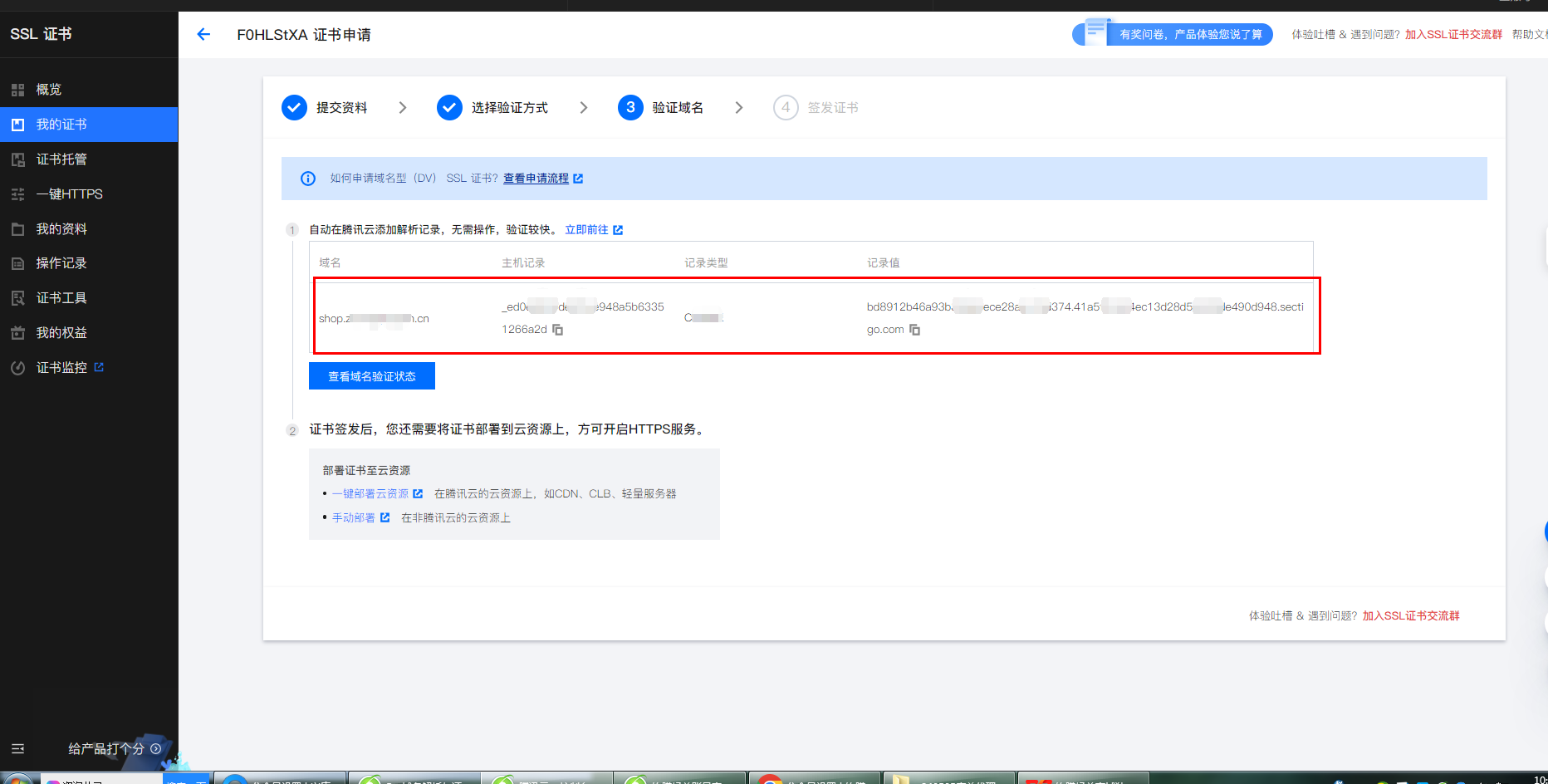 验证域名;点击查看域名验证方式,域名验证成功。