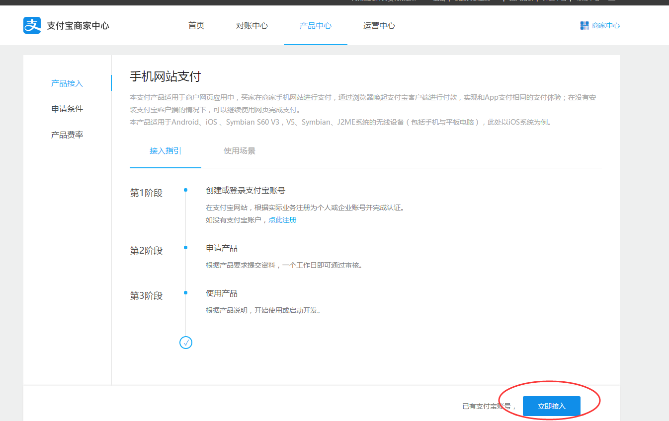 (二)支付宝接入手机网站支付链接:https://b.alipay.com/signing/productDetailV2.htm?productId=I1011000290000001001,点‘立即接入’,签约需要准备的资料:企业经营信息、网址信息(商城首页链接和绑定商城的手机号码和密码)、商户联系人信息,提交申请。服务开通约1个工作日