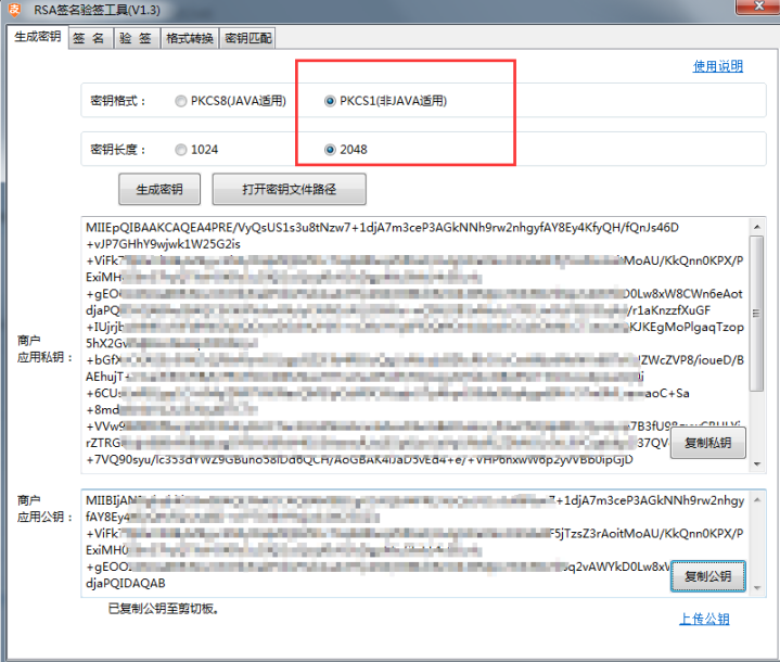 根据开发语言选择密钥格式:PKCS1(非JAVA适用),选择密钥长度2048位。点击 “生成密钥”,会自动生成商户应用公钥和应用私钥。如下三图所示。