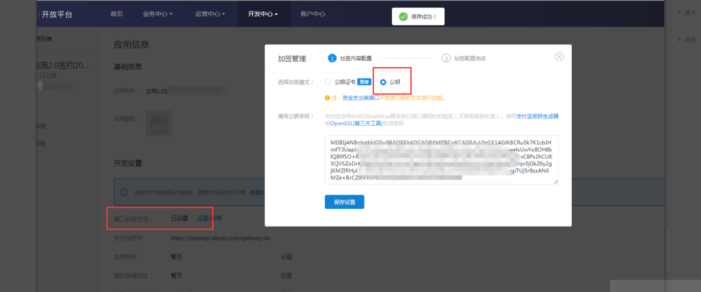 第三步,点击“保存”完成密钥设置,显示上传成功了,即可生成并查看支付宝公钥。