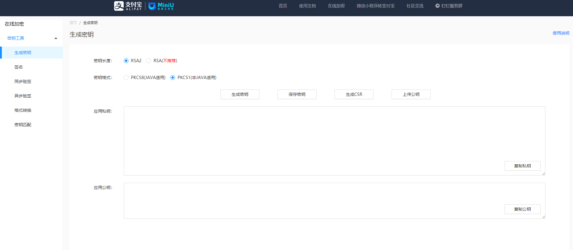 第二种获取公私钥的方法:使用支付宝官方提供的生成rsa公私钥功能,网址 https://miniu.alipay.com/keytool/create ,格式:RSA2, PKCS1(非JAVA适用),其余配置步骤可按上面第一种方法所提及的。