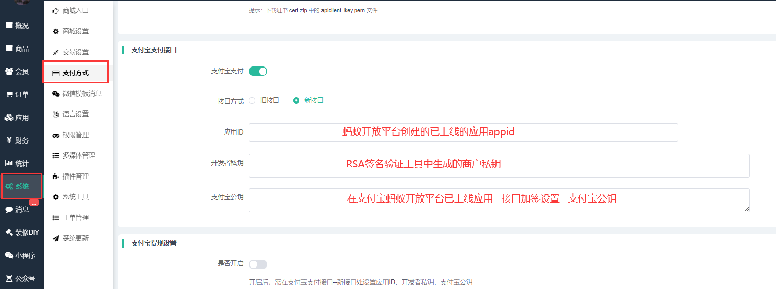 第四步,复制“支付宝公钥”,粘贴到“商城后台--系统--支付方式--支付宝新接口统一配置--支付宝公钥”。