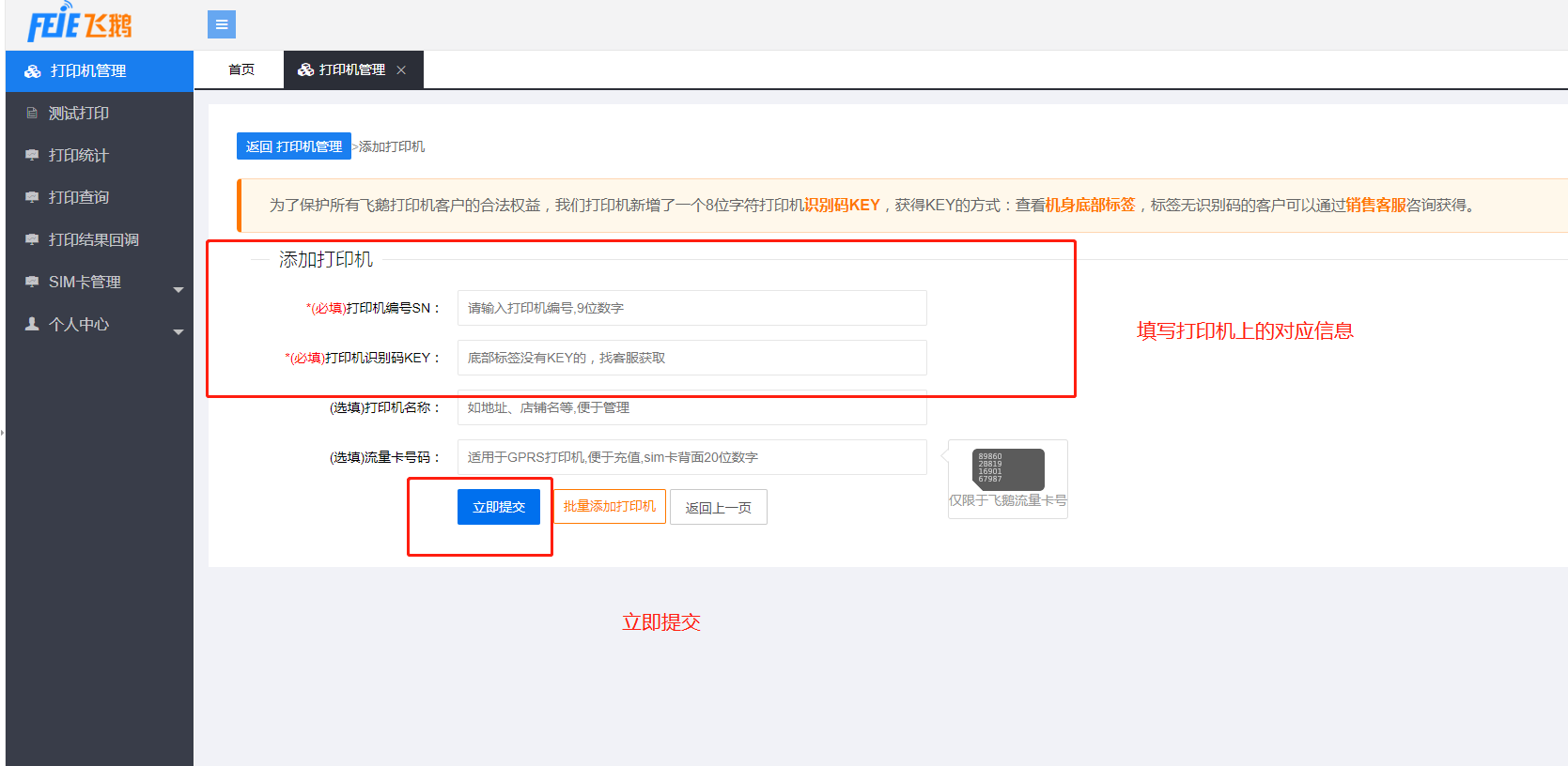 二、注册完毕后选择-打印机管理-添加打印机-确认提交