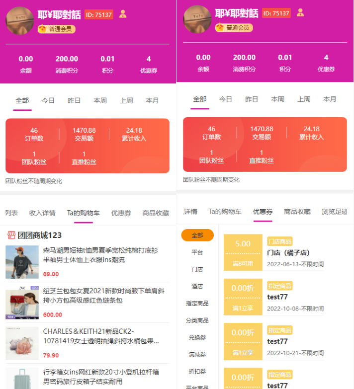 利用客户中心功能,会员可以掌握直推和间推客户的喜好动向,持续让他们买买买,以此来获得更多的收益轨迹追踪 推荐客户详情查看 全方位跟进客户动态。支持微信端、小程序端,若需要轨迹追踪,要搭配“浏览轨迹”插件使用!