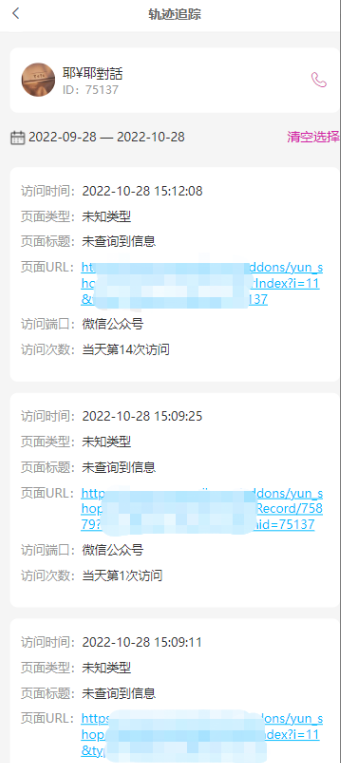 使用场景:会员(推客/员工)在手机前端可以查看下线客户的信息及浏览轨迹