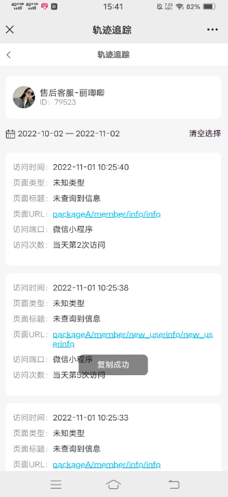 4、在小程序商城,上线浏览下线商城轨迹,若是小程序路径,可以点击跳转对应页面,若是微信商城链接,支持复制,无法直接跳转