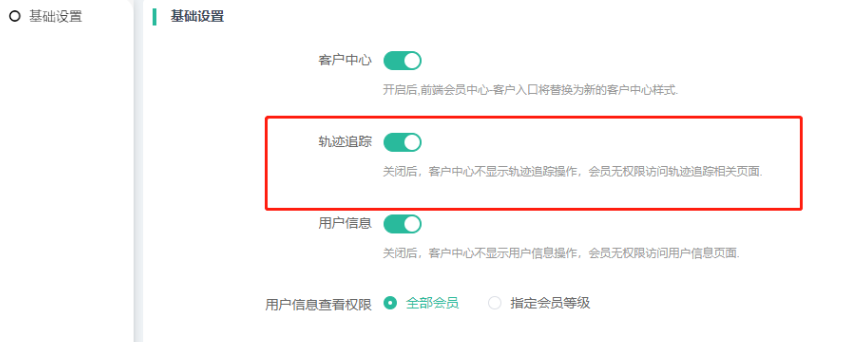 关闭后,客户中心不显示轨迹追踪操作,会员无权限访问轨迹追踪相关页面.